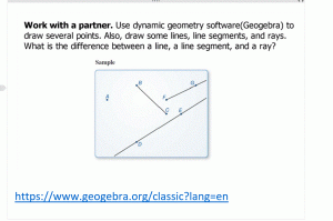 Warm Up: This is also in your warm up section of your One Note Class Notebook then after you complete the activity take a screen shot (snipping tool) capture and add it to your warm up section underneath this (9/8). Then explain what is the difference between a line, line segment, point, and ray. (If you were absent and need help contact me after school and I can help you)